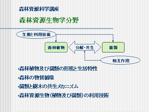 大学院の研究・教育をより充実するために、1998年4月に発足した新分野です。大学院の組織ですが、学部の講義・実験・実習にも参加し4年生の卒論指導も担当しています。森林資源生物学には,研究領域の異なるスタッフがいます。森林科学の中に新しい複合領域の研究を萠芽させるために発足した分野です。そのために他の関連分野との連携にも積極的に取り組みます。